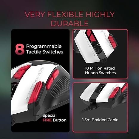Bring your setup to life with 16 million RGB color combinations, complete with a music sync mode, and experience the power of 8 programmable buttons—including a dedicated fire button for rapid action.